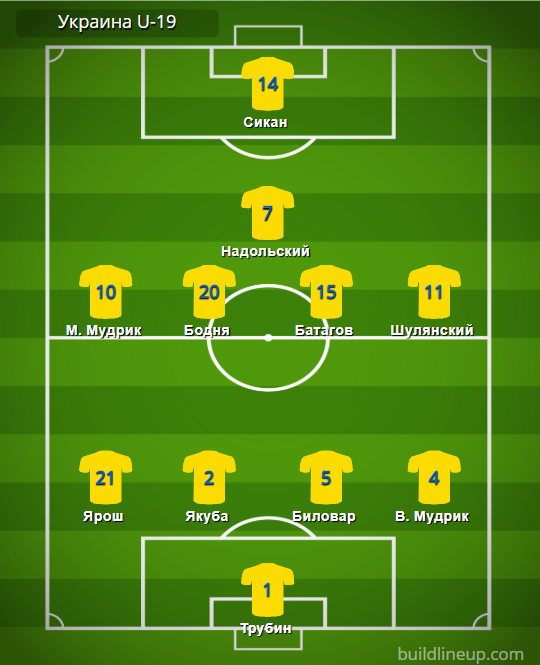 Украина U-19: Трубин – Ярош, Якуба, Биловар, В. Мудрик – М. Мудрик, Бодня (Хондак, 69), Батагов (Гуров, 69), Шулянский (Махонин, 82) – Надольский (Горный, 69) – Сикан (Снисар, 82).