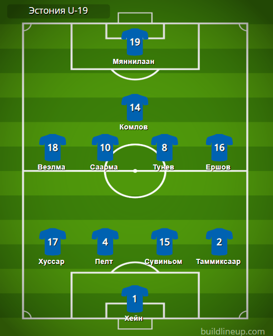 Эстония U-19: Хейн – Хуссар (Кокла, 46), Пелт, Сувиньом, Таммиксаар (Шеннинг-Ларсен, 46) – Веэлма, Саарма (Лаанеотс, 46), Тунев, Ершов (Крутоголов, 46) – Комлов – Мяннилаан (Грауберг Лепик, 76).