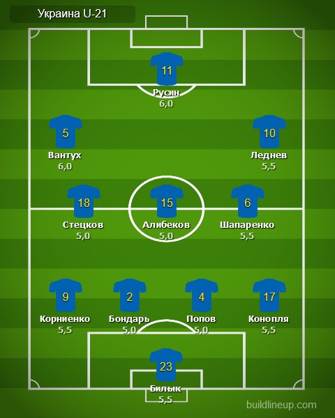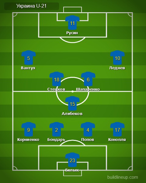 Украина U-21: Олег Билык, Виктор Корниенко, Валерий Бондарь, Денис Попов, Ефим Конопля (Владислав Супряга, 79), Тимур Стецков (Дмитрий Топалов, 64), Ахмед Алибеков (Максим Чех, 46), Николай Шапаренко (Сергей Булеца, 75), Роман Вантух, Назарий Русин, Богдан Леднев (Георгий Цитаишвили, 64)