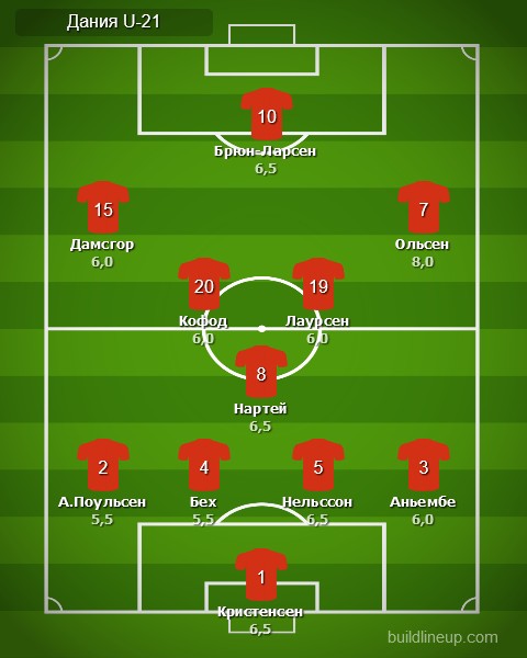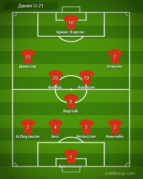 Дания U-21: Оливер Кристенсен, Андреас Поульсен, Мадс Бех, Виктор Нельссон, Даниэль Аньембе (Мортен Юльманн, 83), Магнус Кофод, Николас Нартей (Якоб Серенсен, 75), Николай Лаурсен, Миккель Дамсгор (Андерс Дрейер, 70), Якоб Брюн-Ларсен, Андреас Ольсен (Мадс Расмуссен, 82)
