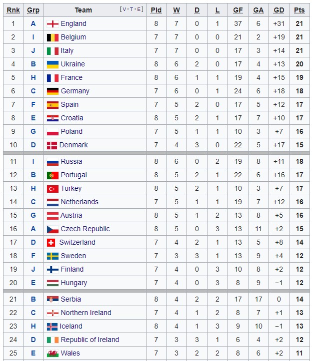 Текущий рейтинг сборных УЕФА для посева на Евро-2020 (топ-25)