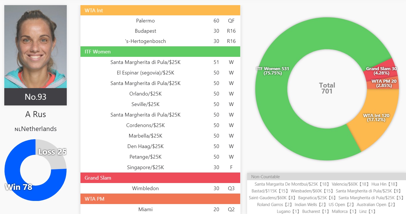 Благодаря частым победам на 25-тысячниках (всего при одном проигранном финальном матче), на которых преимущественно играют теннисистки из третьей сотни и ниже, 28-летней спортсменке удается держаться на границе первой и второй сотни мирового рейтинга. Например, на данный момент в онлайн-рейтинге она занимает 93-ю позицию.