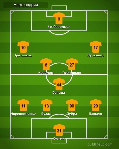 «Александрия»: Олег Билык, Денис Мирошниченко, Глеб Бухал (Антон Шендрик, 72), Каспарс Дубра, Павел Пашаев, Евгений Банада, Кирилл Ковалец, Дмитрий Гречишкин, Максим Третьяков (Максим Задерака, 46), Денис Безбородько (Андрей Запорожан, 67), Валерий Лучкевич