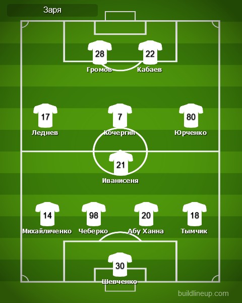 «Заря»: Никита Шевченко, Aлександр Тымчик (Дмитрий Хомченовский, 64), Йоель Абу Ханна, Евгений Чеберко, Богдан Михайличенко, Дмитрий Иванисеня, Владлен Юрченко, Владислав Кочергин (Максим Лунёв, 78), Богдан Леднев, Владислав Кабаев (Назарий Русин, 64), Артем Громов