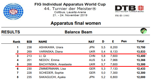 Полные результаты на бревне: