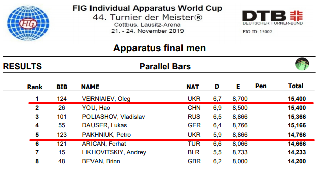 Полные результаты на параллельных брусьях: