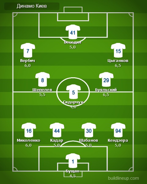 «Динамо»: Георгий Бущан – Виталий Миколенко, Тамаш Кадар, Артем Шабанов, Томаш Кендзёра – Владимир Шепелев (Николай Шапаренко, 71), Сергей Сидорчук, Виталий Буяльский (Денис Гармаш, 89) – Беньямин Вербич (Александр Караваев, 82), Артем Беседин, Виктор Цыганков