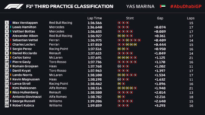 В третьей практике Гран-при Абу-Даби лучшее время показал пилот Ред Булла Макс Ферстаппен, который в конце сессии опередил Льюиса Хэмилтона всего на 0,074 секунды.