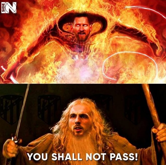26-летнего словенского вратаря «Атлетико» Яна Облака и 32-летнего аргентинского форварда «Барселоны» Лионеля Месси изобразили в виде героев первой части трилогии «Властелин колец». Обыграна знаменитая сцена на мосту Мории, где маг Гэндальф Серый (Ян Облак) сражается с Барлогом (Лионель Месси).