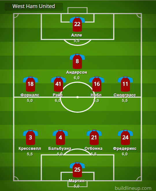 Вест Хэм: Мартин – Крессвелл, Огбонна, Бальбуэна, Фредерикс – Форналс, Райс, Нобл (Холланд, 71), Снодграсс (Ярмоленко, 62) – Андерсон – Алле (Айети, 80).