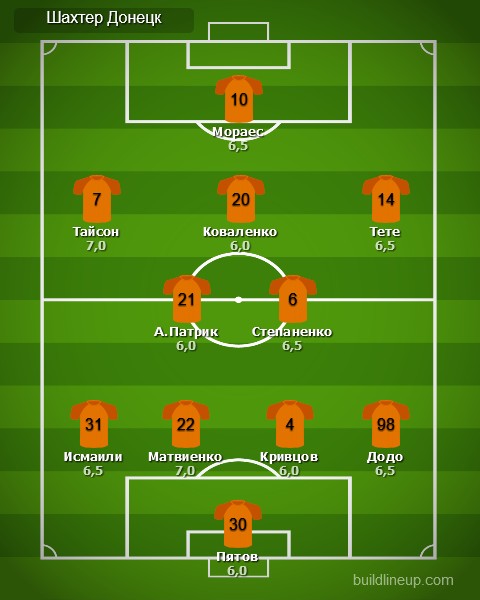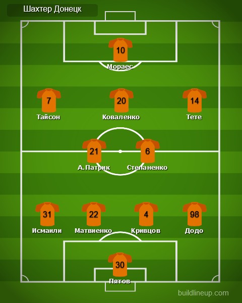 «Шахтер»: Андрей Пятов, Исмаили, Николай Матвиенко, Сергей Кривцов, Додо, Алан Патрик (Маркос Антонио, 88), Тарас Степаненко, Тайсон, Виктор Коваленко (Манор Соломон, 82), Тете (Ромеро Марлос, 68), Жуниор Мораес