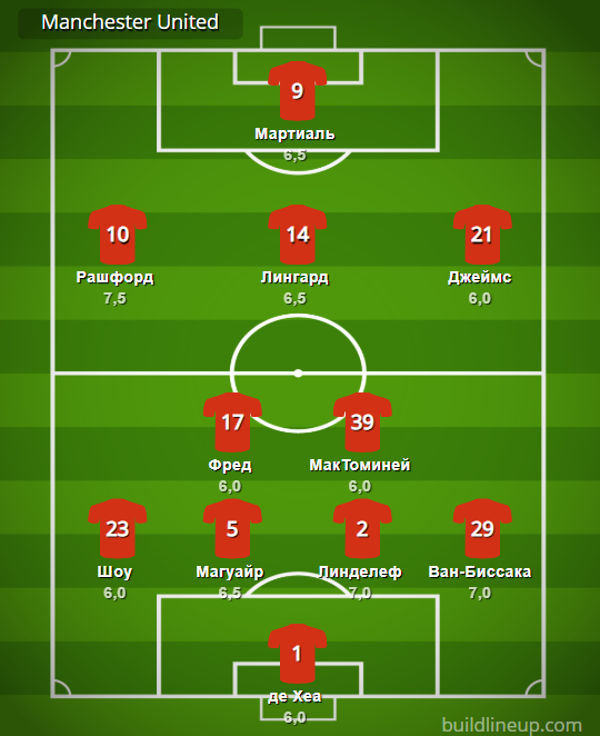 Манчестер Юнайтед: де Хеа – Шоу (Янг, 88), Магуайр, Линделеф, Ван-Биссака – Фред, МакТоминей – Рашфорд, Лингард (Туанзебе, 88), Джеймс – Мартиаль (Перейра, 74).