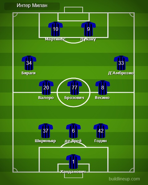 «Интер»: Самир Ханданович – Милан Шкриньяр, Стефан де Врей, Диего Годин – Кристиано Бираги (Валентино Лазаро, 69), Борха Валеро (Себастьяно Эспозито, 77), Марцело Брозович, Матиас Весино, Данило Д'Амброзио (Маттео Политано, 75) – Лаутаро Мартинес, Ромелу Лукаку