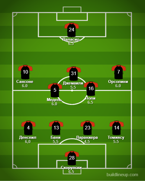 «Болонья»: Скорупски - Томиясу, Ларанжера, Бани, Денсвил - Орсолини (Мбайе, 89), Медель (Сванберг, 63), Джемаили, Поли, Сансоне - Паласио (Сантандер, 78)