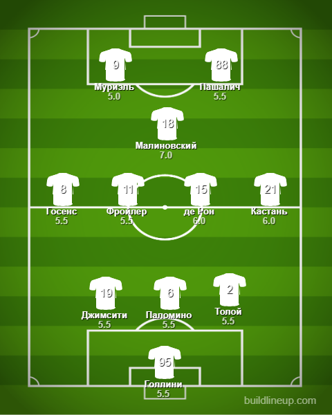 «Аталанта»: Голлини - Толой, Паломино, Джимсити - Кастань (Хатебур, 63), Де Рой, Малиновский, Фройлер (Бэрроу, 53), Госенс - Пашалич, Муриэль (Колли, 83)