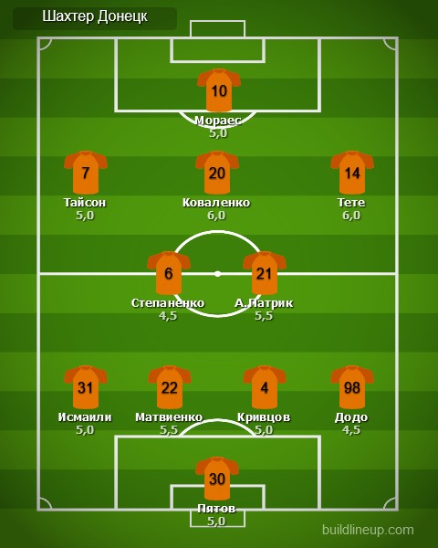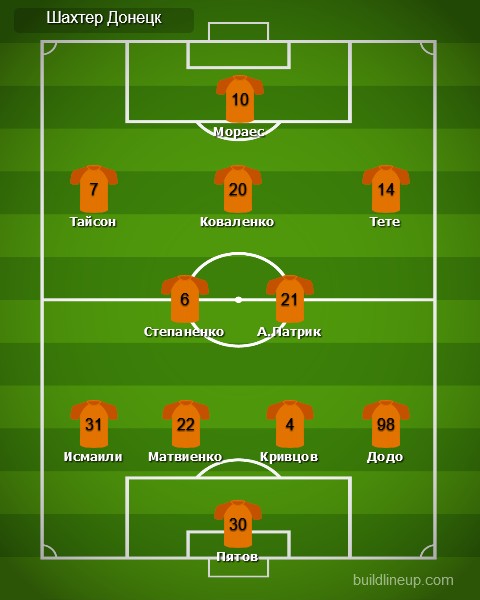 «Шахтер»: Андрей Пятов, Сергей Кривцов, Николай Матвиенко, Исмаили, Додо, Тарас Степаненко, Алан Патрик, Тайсон, Виктор Коваленко (Манор Соломон, 71), Тете (Ромеро Марлос, 59), Жуниор Мораес.