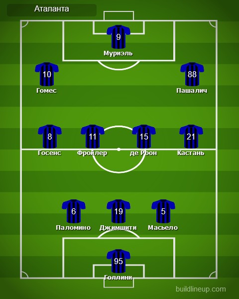 «Аталанта»: Пьерлуиджи Голлини, Андреа Масьелло (Руслан Малиновский, 61), Хосе Луис Паломино, Робин Госенс, Ремо Фройлер, Мартен де Роон, Берат Джимшити, Тимоти Кастань, Алехандро Гомес (Ханс Хатебур, 90), Луис Муриэль (Рожер Ибаньес, 71), Марио Пашалич.