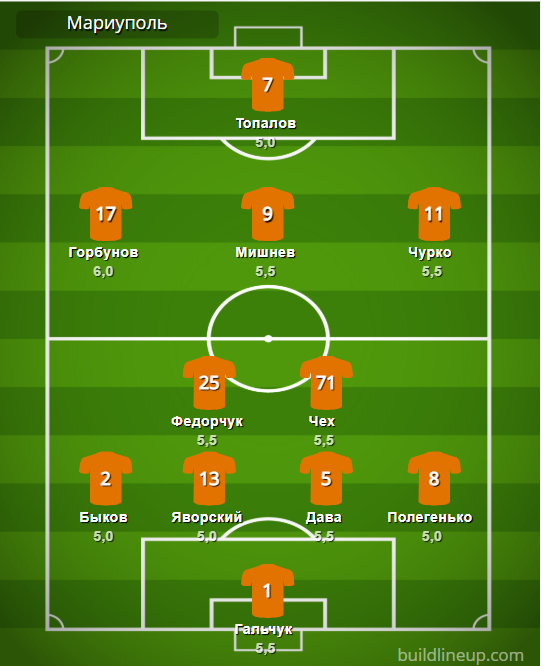 Мариуполь: Гальчук – Быков, Яворский (Чоботенко, 77), Дава, Полегенько – Федорчук, Чех – Горбунов, Мишнев, Чурко (Кащук, 90+2) – Топалов (Путря, 87).