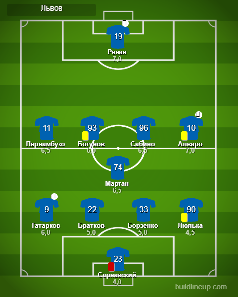 «Львов»: Сарнавский – Татарков, Борзенко, Гончар, Люлька – Мартан – Богунов, Сабино, Алваро (Велвес, 85), Пернамбуко (Бандура, 61) – Ренан (Ныч, 78).