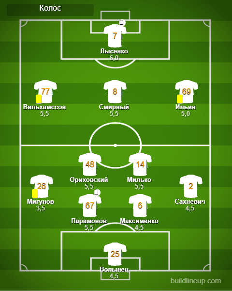 «Колос»: Волынец – Сахневич, Максименко, Парамонов, Мигунов (Зозуля, 46) – Милько (Бондаренко, 75), Ориховский, Смирный, Ильин (Нехтий, 81), Вильхамссон – Лысенко.