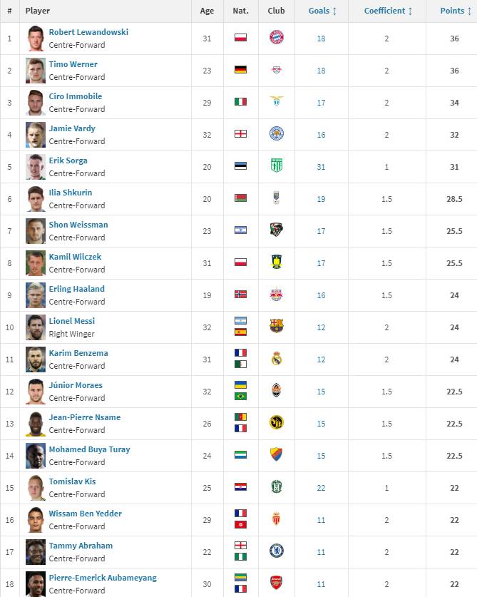 В Европе продолжаются европейские чемпионаты. Лидерами в текущем рейтинге ESM Golden Shoe («Золотая бутса») являются поляк Роберт Левандовски из «Баварии» и немец Тимо Вернер из РБ «Лейпциг». Каждый из них имеет в своем активе 18 голов и 36 очков.