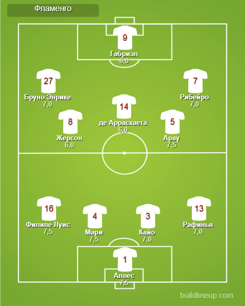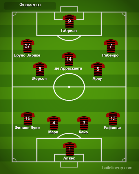 «Фламенго»: Диего Алвес - Родриго Кайо, Рафинья, Филипе Луис, Пабло Мари, Жерсон (Линкольн, 102) - Виллиан Арау (Орландо Беррио, 120), Хиорхьян де Арраскаета (Витиньо, 77), Эвертон Рибейро (Диего, 82) - Бруно Энрике, Габриэл.
