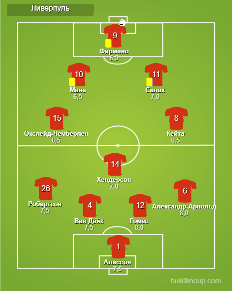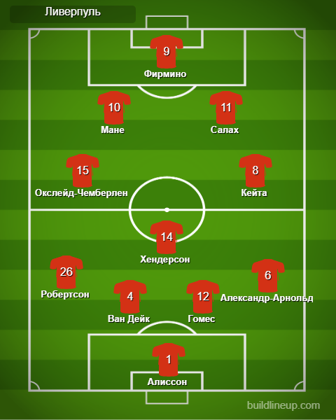 «Ливерпуль»: Алиссон Бекер - Эндрю Робертсон, Трент Александер-Арнольд, Джозеф Гомес, Вирджил ван Дейк - Наби Кейта (Джеймс Милнер, 100), Джордан Хендерсон, Алекс Окслейд-Чемберлен (Адам Лаллана, 75) - Садио Мане, Роберто Фирмино (Дивок Ориги, 106), Мохамед Салах (Шердан Шакири, 120+1).