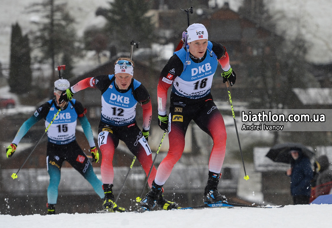 Норвежец Йоханнес Бё оформил золотой дубль, выиграв масс-старт вслед за персьютом на этапе в Анси. Француз Эмильен Жаклен порадовал местную публику, став вторым. Брат триумфатора этапа Тарьей взял бронзовую медаль. Все трое призеров оставили незакрытой по одной мишени.