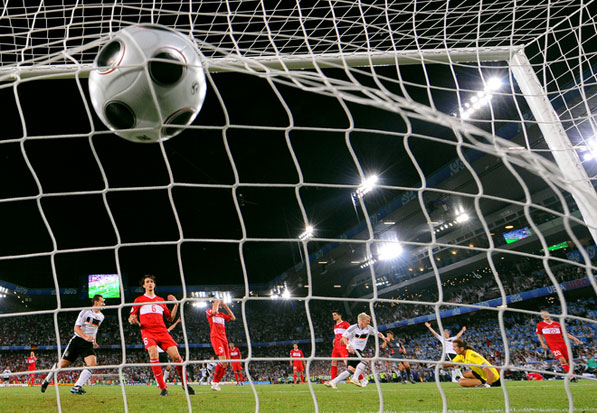 Ну, да Бог с ними, с их хваленым швейцарским качеством. Перейдем к самой игре. Первый тайм, который мы, к счастью, смогли увидеть полностью, был на редкость интересным и развивался по довольно-таки неожиданному сценарию. Обескровленная многочисленными травмами и дисквалификациями игроков турецкая команда, удивила своей блестящей игрой и, уже в который раз, бойцовскими качествами. Почти каждая их атака завершалась прицельным ударом по воротам Йенса Леманна. В первой 45-минутке турки 15 раз били по воротам, из них 7 раз мяч отражал немецкий голкипер, и еще 2 раза вратарю помогла перекладина. Для сравнения, немцы лишь 3 раза били по воротам Рюшту и только один раз точно. Сборная Германии выглядела тяжеловато. А вот турки, как-будто, летали по полю. Самым активным среди них был Казим, буквально, затерзавший немецкую оборону. Уже на первых минутах дважды Леманну пришлось вступать в игру, ликвидируя острые проходы Казима. На 13 минуте мяч после его удара отразила перекладина, а подоспевший на добивание Шентюрк, не сумел поразить ворота, так как его удар заблокировал защитник. На 22 минуте после удара Казима мяч вновь попал в перекладину и отскочил прямо в ноги к Боралу, и тот в касание направил мяч в сетку ворот. 0:1.