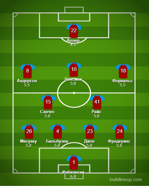 «Вест Хэм»: Фабиански - Фредерикс, Бальбуэна, Диоп, Масуаку - Райс, Санчес (Снодграсс, 61) - Форнальс, Лансини (Аети, 70), Андерсон - Аллер (Антонио, 54)