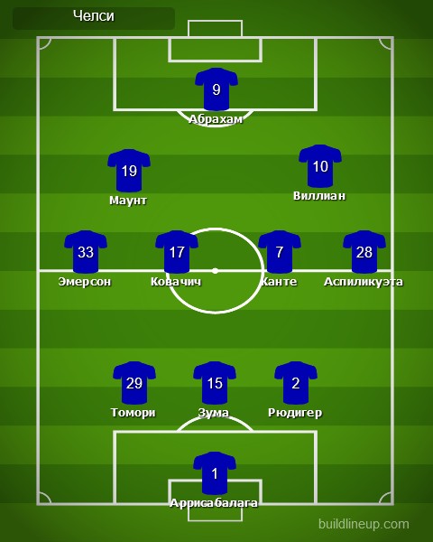 «Челси»: Кепа Аррисабалага, Антонио Рюдигер, Эмерсон (Жоржиньо, 34), Сесар Аспиликуэта, Фикайо Томори (Тарик Лампти, 59), Курт Зума, Матео Ковачич (Каллум Хадсон-Одои, 70), Н'Голо Канте, Мэйсон Маунт, Виллиан, Тэмми Абрахам