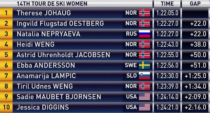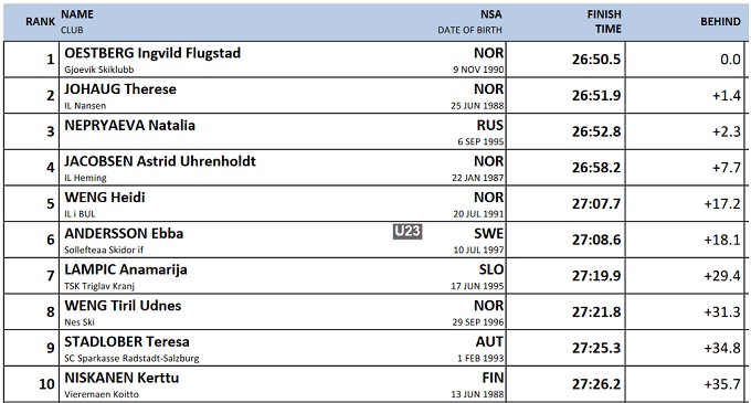 Остберг як кліщами вчепилась в Йохауг а на фініші продемонструвала свої спринтерські якості-давно дистанцію Йохауг не програвала-тільки порядок гонки переслідування такий Остберг Йохауг Венг Нєпряєва