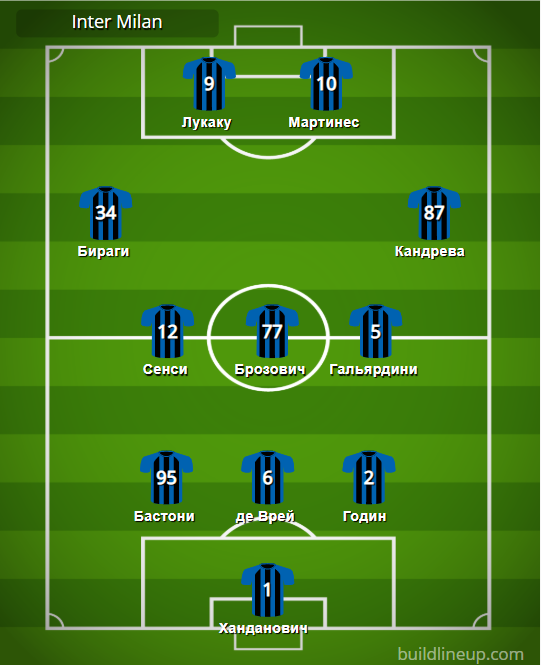 Интер: Ханданович – Бастони, де Врей, Годин – Бираги, Сенси (Борха Валеро, 71), Брозович, Гальярдини, Кандрева – Мартинес (Политано, 80), Лукаку.