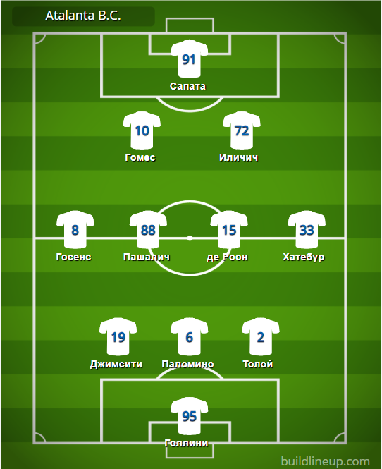 Аталанта: Голлини – Джимсити, Паломино, Толой – Госенс (Кастань, 90+1), Пашалич (Муриэль, 70), де Роон, Хатебур – Гомес, Иличич – Сапата (Малиновский, 53).