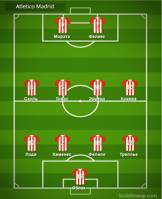 Атлетико: Облак – Лоди (Льоренте, 89), Хименес (Савич, 98), Фелипе, Триппье – Сауль, Томас, Эррера (Витоло, 56), Корреа – Мората, Феликс (Ариас, 101).