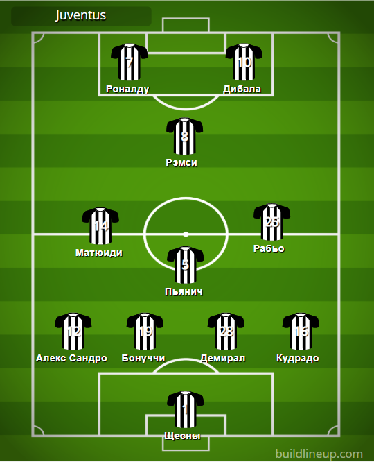 Ювентус: Щесны – Алекс Сандро, Бонуччи, Демирал (де Лигт, 19), Кудрадо – Матюиди, Пьянич, Рабьо – Рэмси (Данило, 70) – Роналду, Дибала (Игуаин, 69).