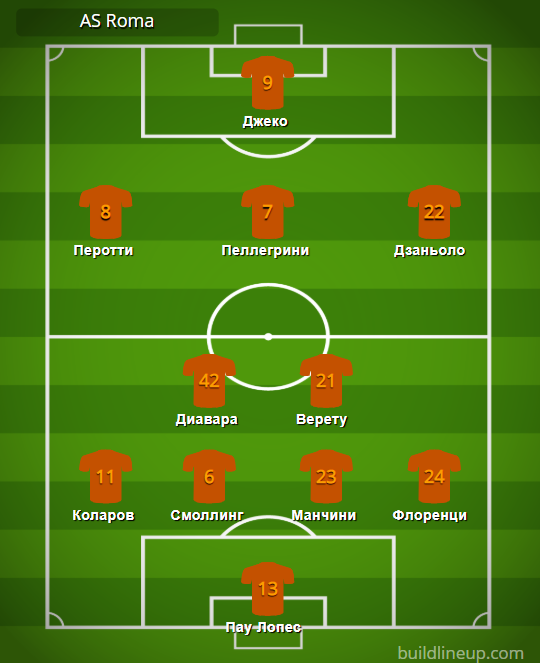 Рома: Пау Лопес – Коларов, Смоллинг, Манчини, Флоренци – Диавара, Верету (Кристанте, 66) – Перотти (Калинич, 82), Пеллегрини, Дзаньоло (Ундер, 36) – Джеко.