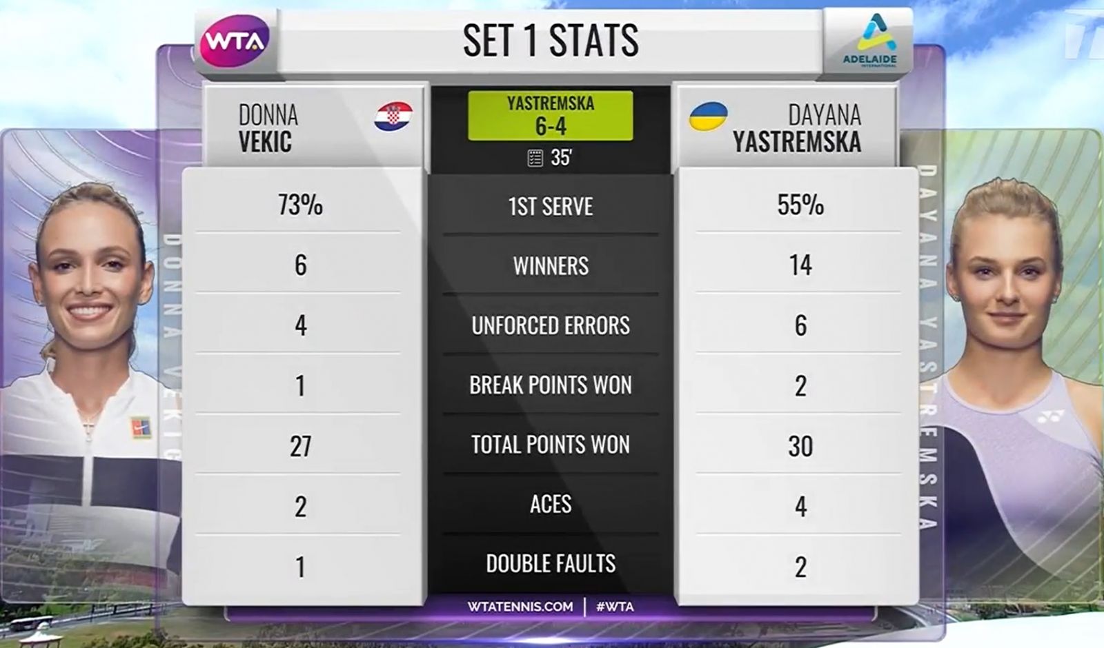 Для начала отметим, что Векич – весьма удобоваримая соперница для Ястремской, пожалуй, из топ-20 – это один из лучших матчапов. Обе участницы сегодняшнего матча привыкли играть в остроатакующий теннис, но Донна немного уступает украинке в мощи, хотя технический арсенал у нее не хуже. Сегодняшний матч полностью оправдал прогноз Даяны, обе девушки не изменили своему стилю.
