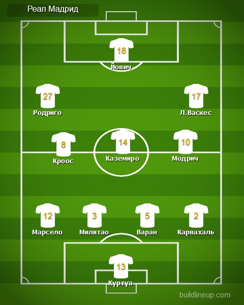 «Реал»: Тибо Куртуа, Марсело (Ферлан Менди, 71), Эдер Милитан, Рафаэль Варан, Даниэль Карвахаль, Тони Кроос, Каземиро, Лука Модрич, Лукас Васкес, Родриго (Винисиус Жуниор, 62), Лука Йович (Карим Бензема, 62)