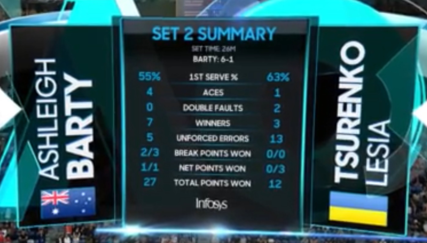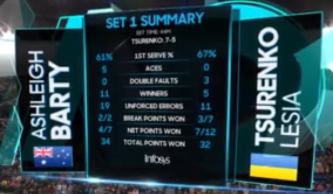 Первая партия проходила с переменным успехом. Леся дважды первой делала брейк, но Барти оба раза уравнивала ситуацию на корте. В одиннадцатом гейме Цуренко удалось заработать тройной скрытый сетбол и с третьего раза Барти ударила в аут. Оставалось только подать на сет, получилось со второй попытки.