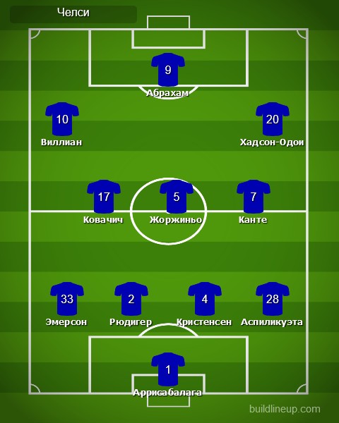 «Челси»: Кепа Аррисабалага, Эмерсон, Антонио Рюдигер, Андреас Кристенсен, Сесар Аспиликуэта, Матео Ковачич (Росс Баркли, 66), Жоржиньо, Н'Голо Канте (Мэйсон Маунт, 69), Виллиан (Миши Батшуайи, 79), Тэмми Абрахам, Каллум Хадсон-Одои