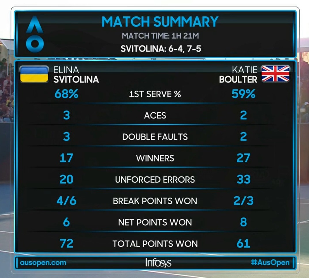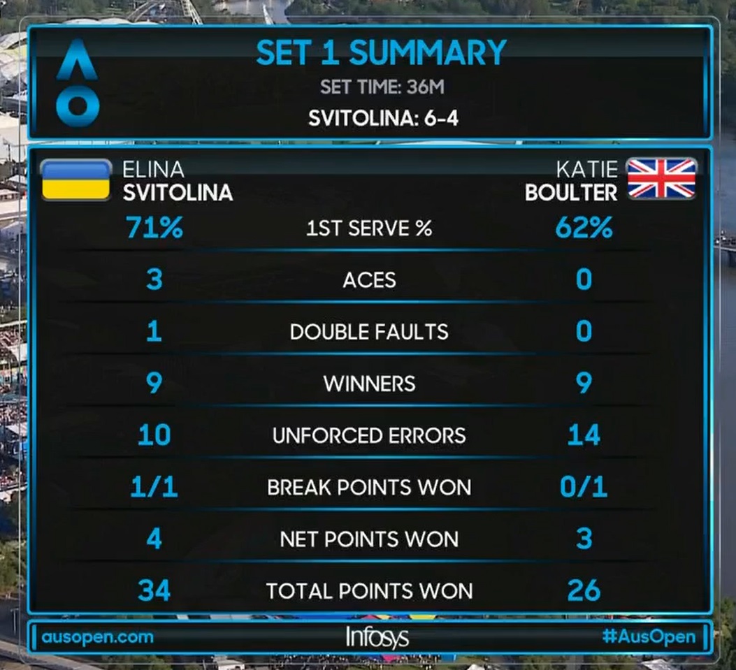 Концовка сета снова вышла непростой, пришлось больше атаковать самой, да и пара ошибок соперницы сыграли свою ключевую роль. По итогу заслуженная, но далеко не самая простая победа для украинки. Финальная статистика довольно неплохая, но дальше нужно обязательно добавлять. Отдельно отметим Бултер. 27 виннерсов против Свитолиной в двух сетах – прекрасный результат для любой теннисистки. Британка набирает неплохую форму после возвращения, связанного с травмой спины, и может выйти на качественно новый уровень.