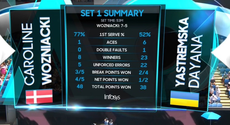 Начало первого сета было впечатляющим. Возняцки взяла свою подачу, после чего Даяна выиграла пять геймов кряду. У Ястремской все получалось, мячи ложились в корт и казалось, что в этом матче ее ждет такая же быстрая победа, как и в первом поединке на турнире.