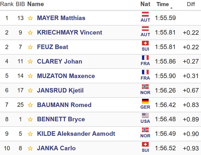 Австрийский горнолыжник Маттиас Майер выиграл скоростной спуск на легендарной трассе «Штрайф» в Китцбюэле. Второе место поделили Винсент Крихмайр и Беат Фойц.