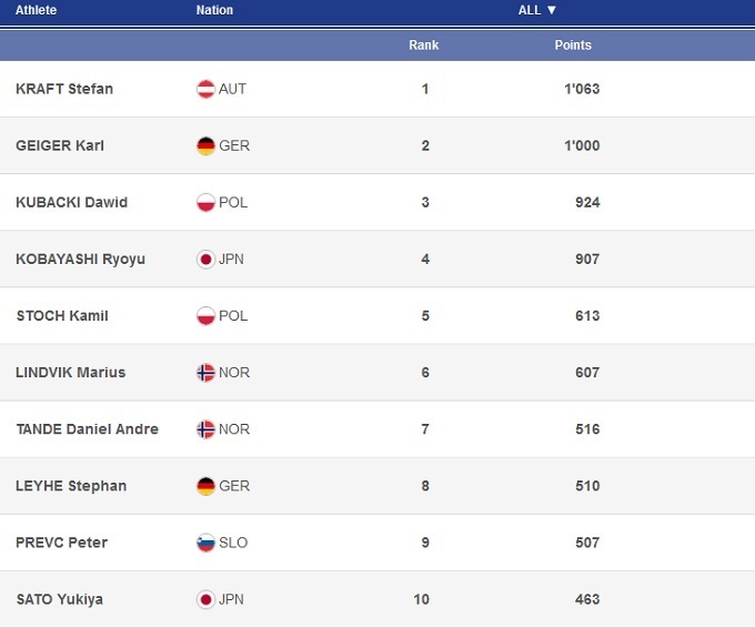 Что касается лидера Бундестима Карла Гайгера, то он после 11-го места в субботу в воскресенье снова вмешался в борьбу за самые высокие места. После первой попытки он шел третьим, однако во втором раунде ему снова достались непростые ветровые условия, и он отступил на пятое место. В общем зачете Гайгер уступает Крафту всего 63 балла – ни для него, ни для Кубацки с Кобаяси, еще ничего не потеряно. Однако теперь именно австриец становится фаворитом №1, особенно учитывая, что впереди грядут этапы на гигантских трамплинах в Тауплице и Викерсунде, и именно Крафт из четверки претендентов на БХГ является базово самым сильным полетчиком.