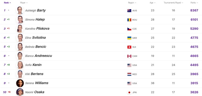 После Australian Open в женском мировом рейтинге состоялись некоторые изменения. Звания первой ракетки сохранила Эшли Барти. Чемпионка Открытого чемпионата Австралии София Кенин ворвалась в первую 10-ку и заняла 7-е место. Также свои позиции улучшили Симона Халеп, Элина Свитолина, Белинда Бенчич и Кики Бертенс.