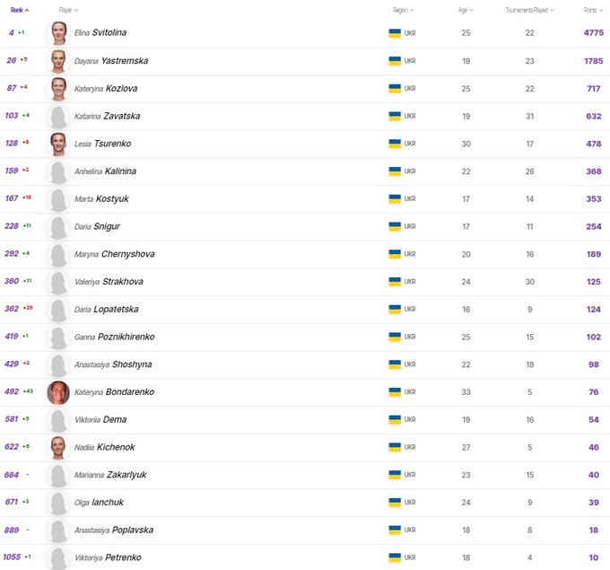 Среди украинок кроме Свитолиной, которая поднялась на одно место, улучшением позиций может похвастаться Катарина Завацкая. Другие топовые украинские теннисистки немного потеряли в рейтинге. Ястремская опустилась на 26-е место, Козлова на 87-е, Леся Цуренко на 128-ю позицию.
