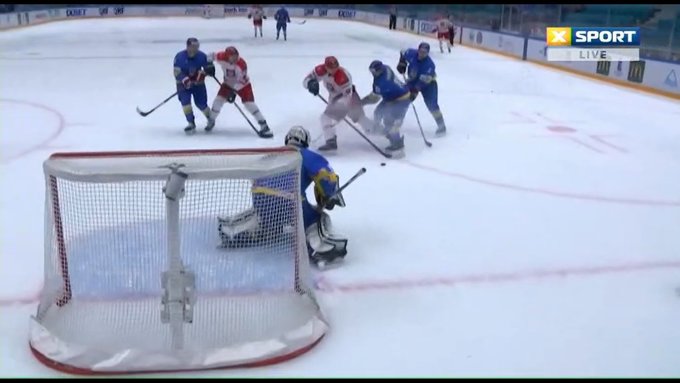 41 мин. ГОЛ. 4:1. Фантастически курьезный гол пропускает Украина. После броска шайба угодила в перекладину сверху, выскочила на пятачок, а там растерявшийся защитник Украины просто взял и рукой забросил шайбу в свои ворота. Феерический автогол!