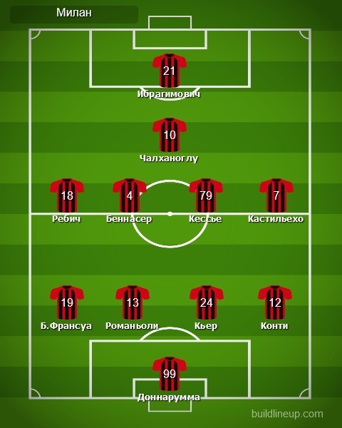 «Милан»: Джанлуиджи Доннарумма, Симон Кьер, Андреа Конти, Тео Бернар Франсуа, Алессио Романьоли, Исмаэль Беннасер, Франк Кессье (Лукас Пакета, 81), Самуэль Кастильехо (Рафаэл Леау, 79), Хакан Чалханоглу, Анте Ребич (Джакомо Бонавентура, 84), Златан Ибрагимович