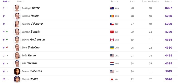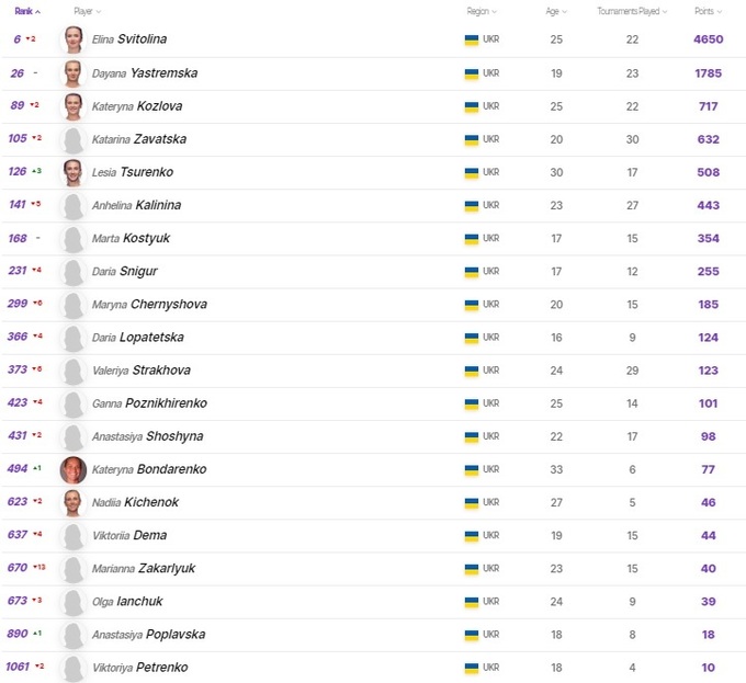 Среди других украинок на три места поднялась Леся Цуренко. Катерина Козлова, Катарина Завацкая и Ангелина Калинина потеряли по несколько позиций.